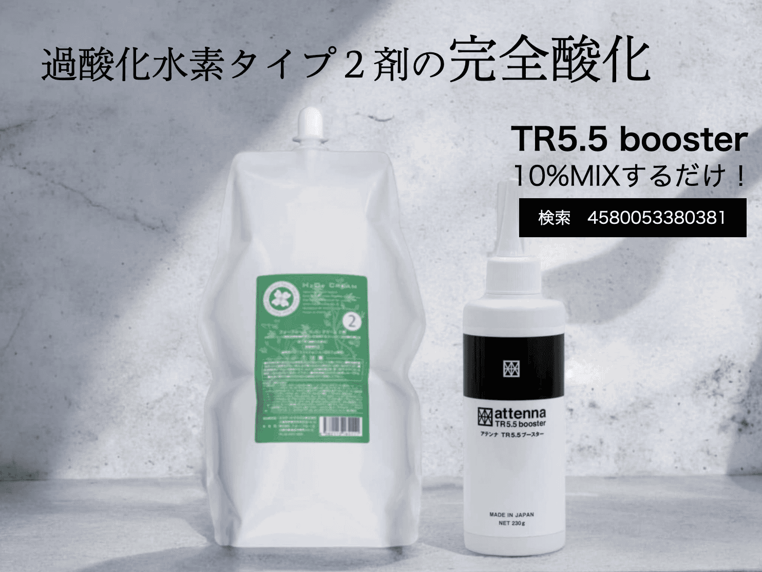 TR5.5 boosterは過酸化水素水の反応をどの様な1剤条件下でも毛髪内部から表層部まで完全に酸化反応を行うために開発された2剤添加剤です。