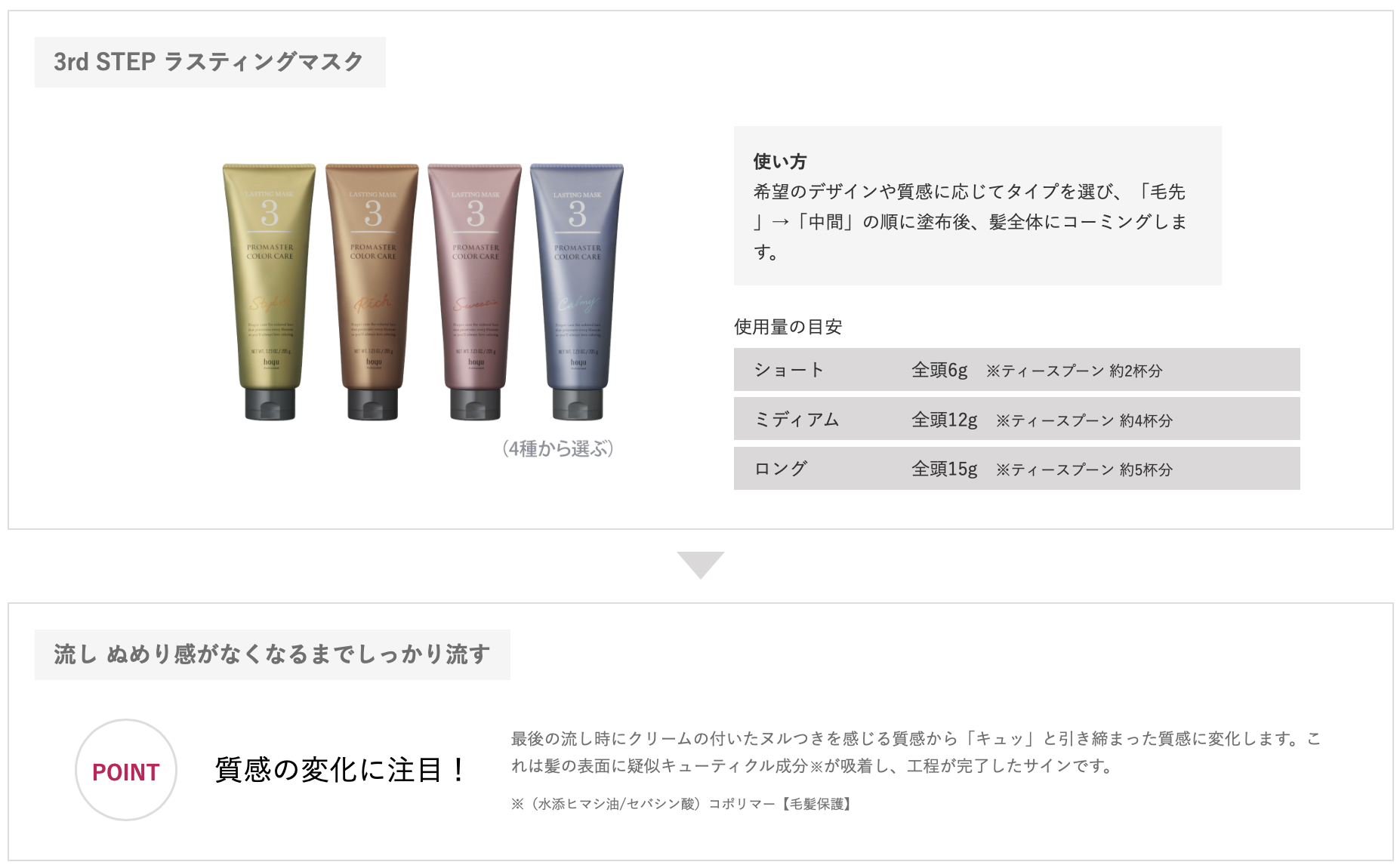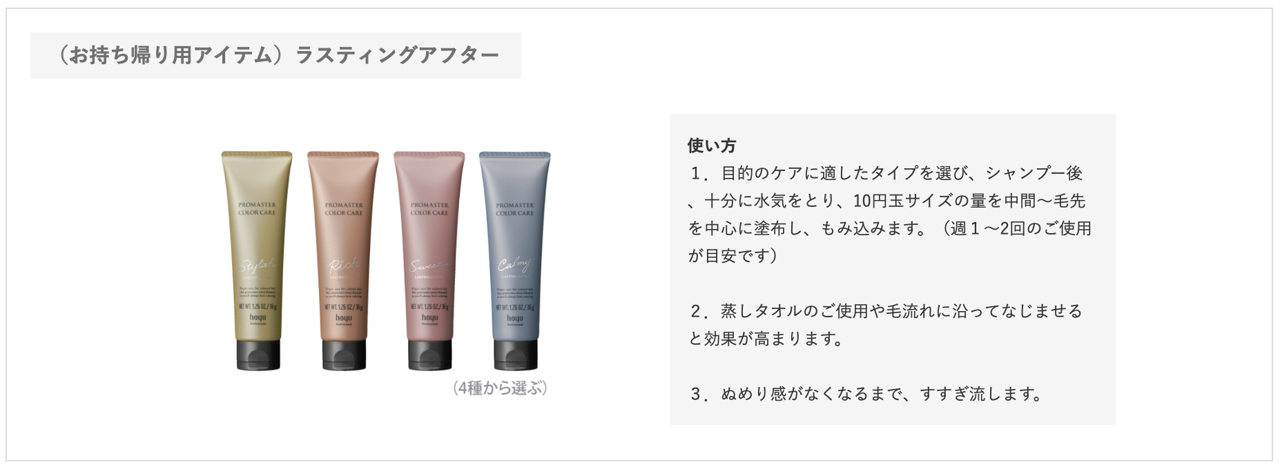 カラー後のダメージ因子を除去しながら髪のベースを作る「バッファーケア」、ダメージ部を内部から補修して健やかな髪に保つ「インサイドケア」、髪の悩みに応じて選ぶ4種の「ラスティングマスク」で髪を均一な素材感に導きます。