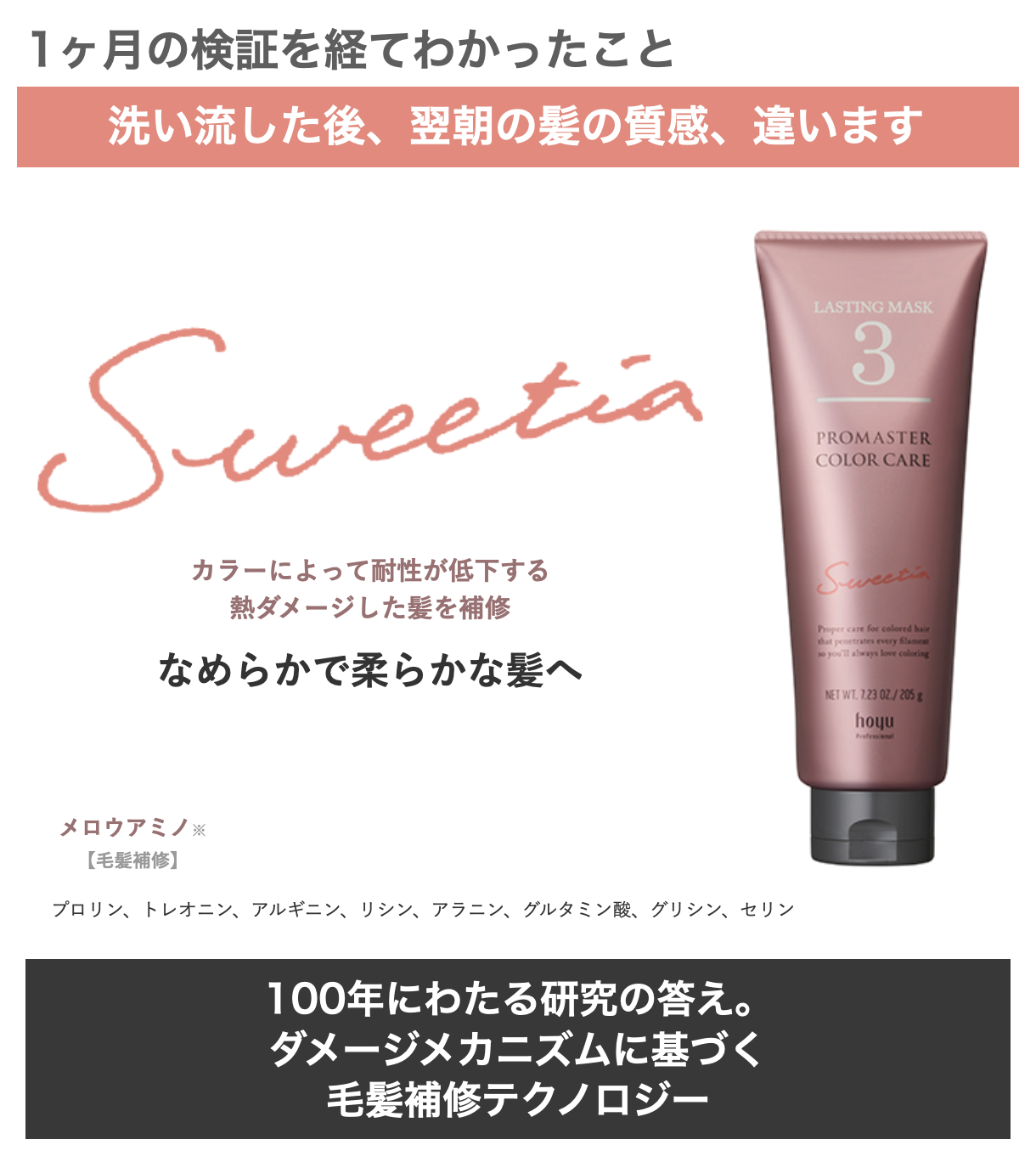 PROMASTER COLOR CAREはカラーダメージを補修し、”今と未来”の美しい髪を実現するための素材を育みます。