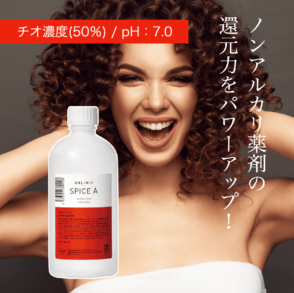 スパイスAはチオを高濃度に配合、コルテックス内の親水性S-S結合に働きかけるため、リッジ感の強いカールデザインや、のばしづらいくせを簡単にのばすことができます。