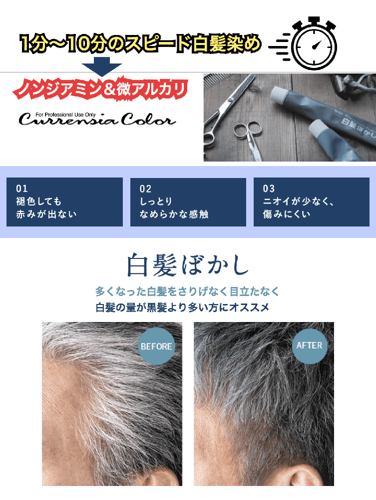 白髪をしっかり染めるのではなく、自然に「ぼかす」ためのメンズヘアカラーです。