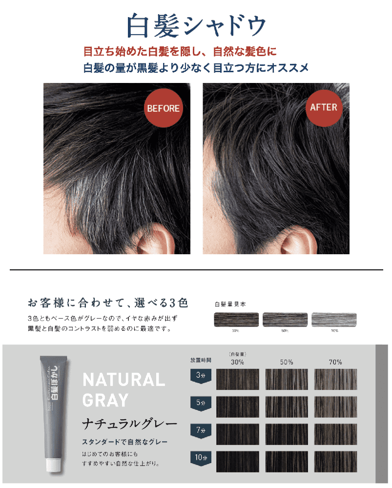 白髪をしっかり染めるのではなく、自然に「ぼかす」ためのメンズヘアカラーです。