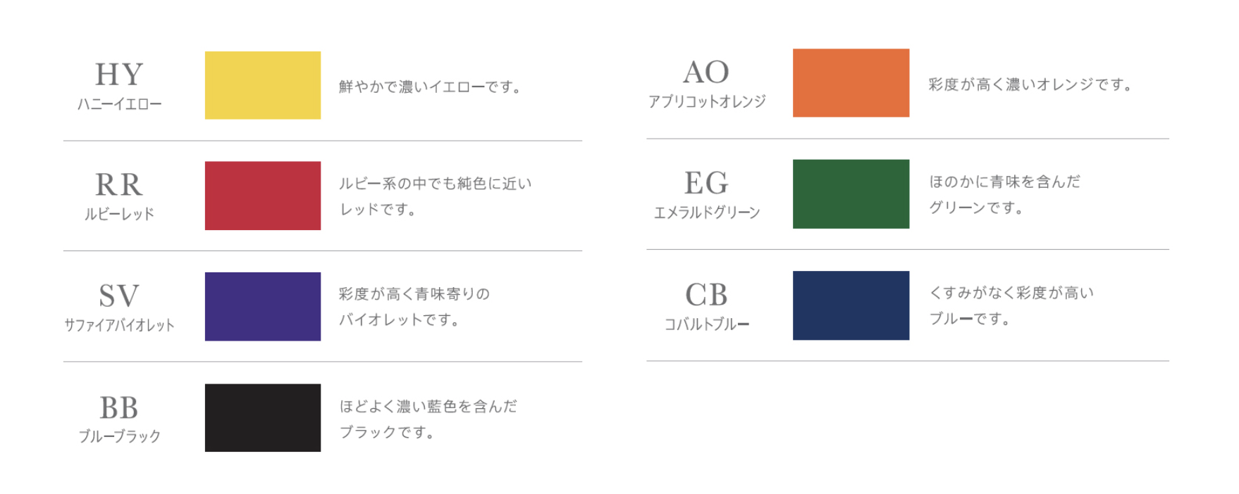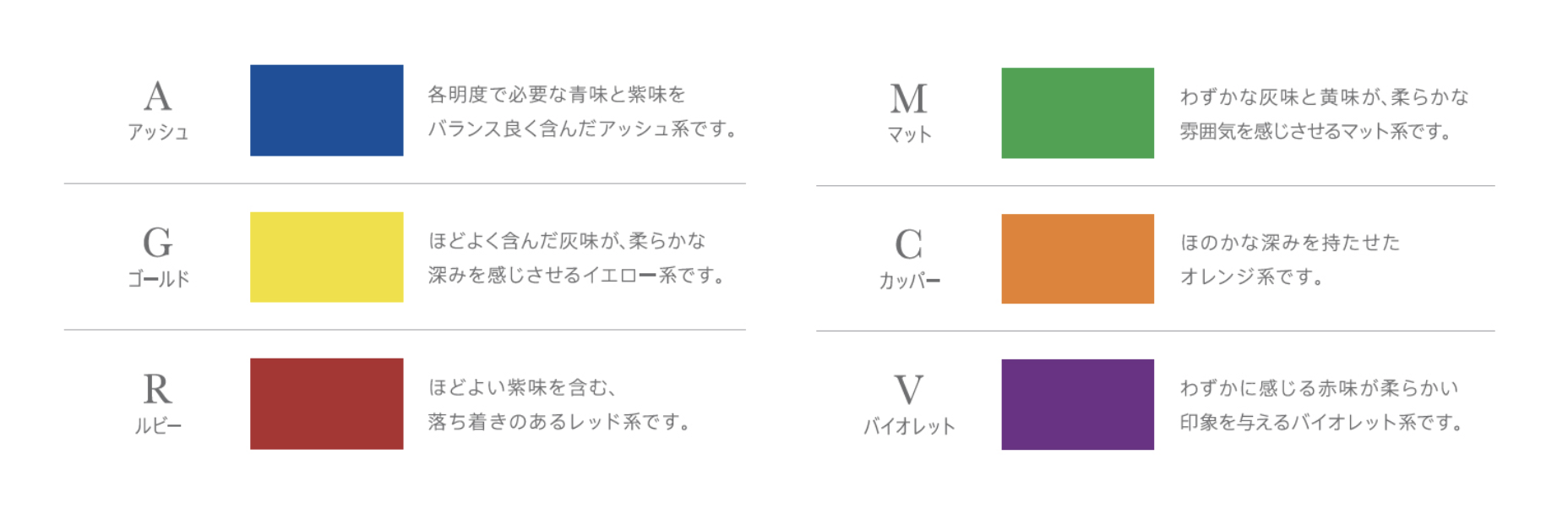 色相環を構成する6色調をバランス良く配置しています。