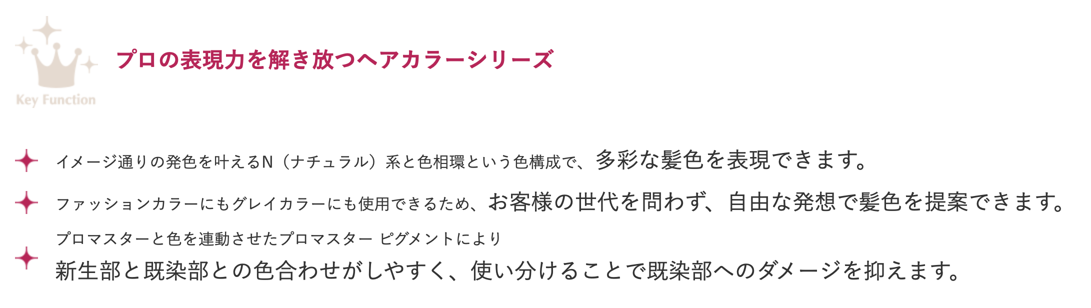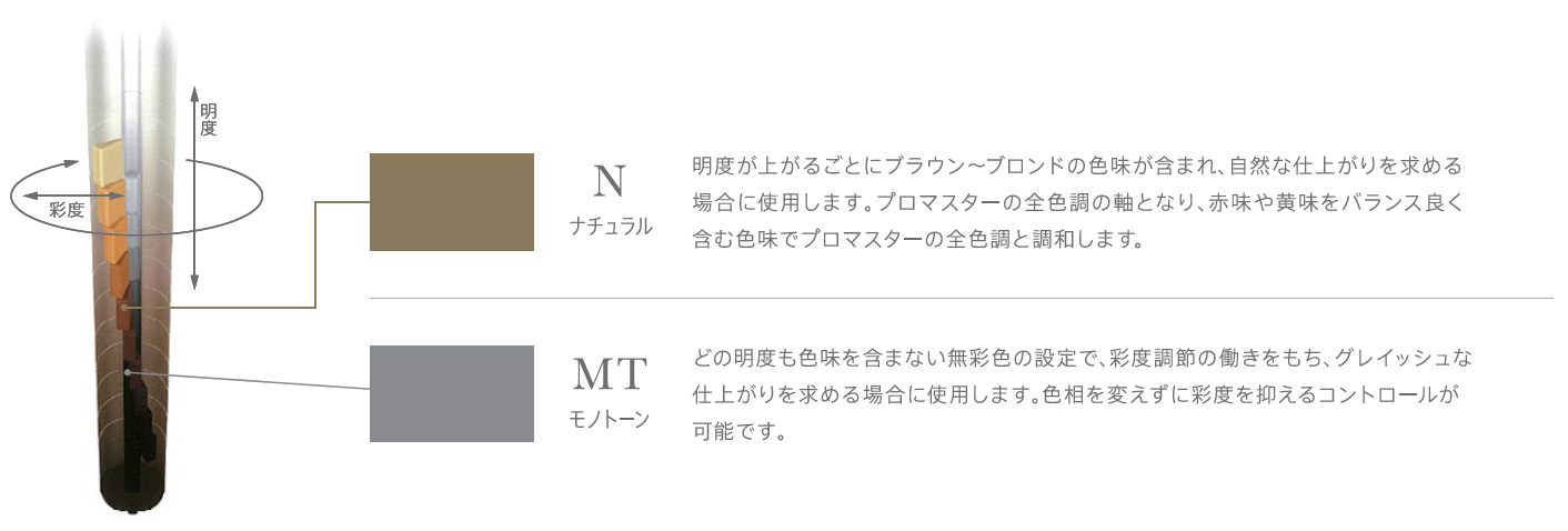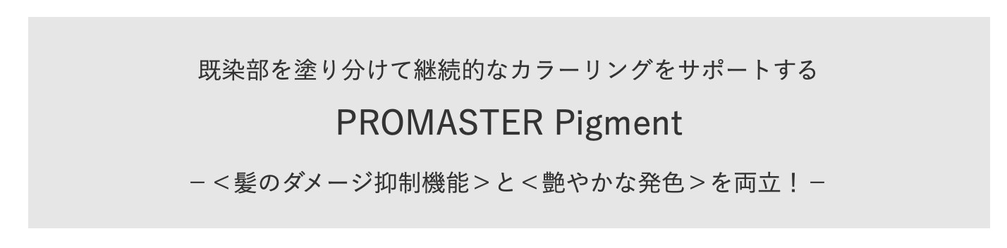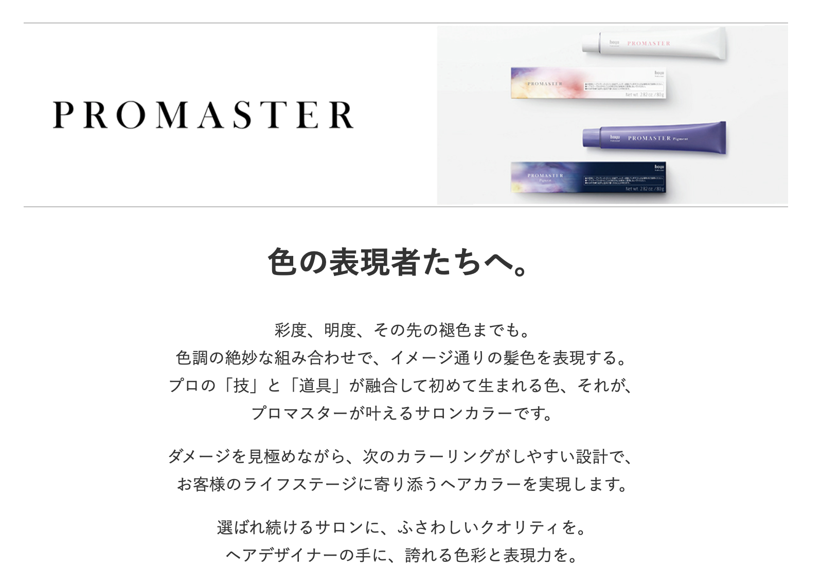 プロマスターは質感も発色も美しく、いつまでも思い通りに楽し めるカラーリングライフをサポートします。