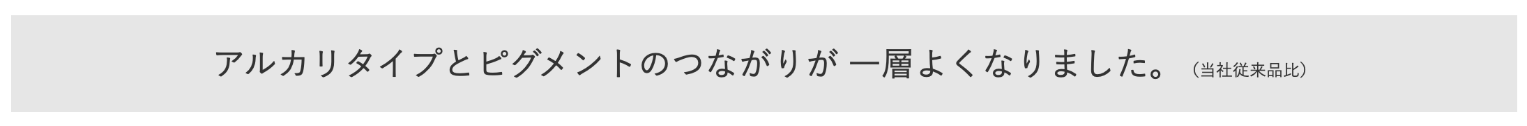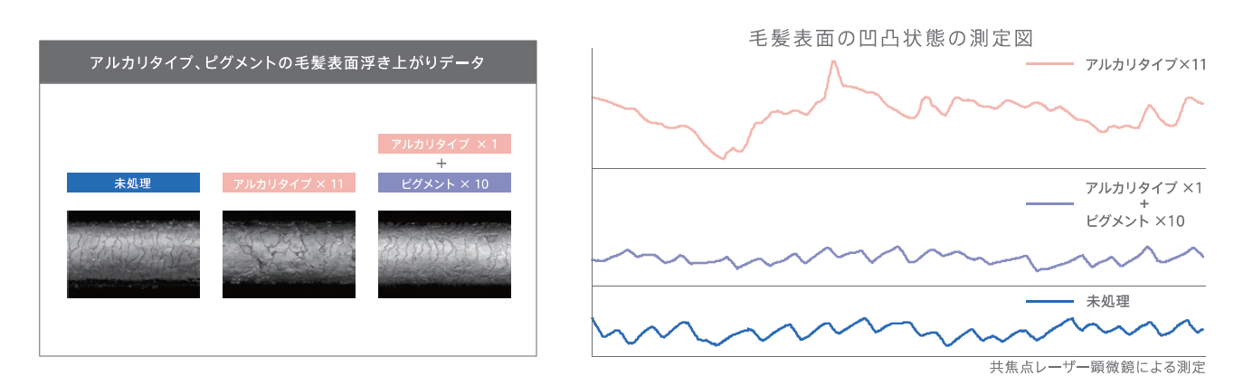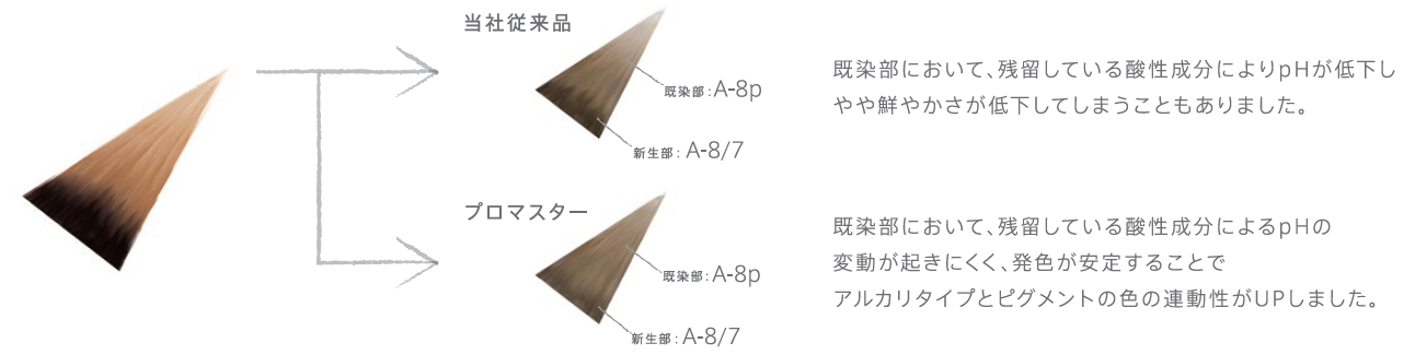 当社従来品は、毛髪の状態によってはpHが変動し、鮮やかさが低下してしまうことがありました。新設計のピグメントは、当社従来品と比べてpHがブレにくい処方(ストロングバッファーフォーミュラ)を採用することで、より安定して、鮮やかな発色と髪のダメージの抑制を実現することができるようになりました。アルカリタイプと連動した色番号の設定でデザインカラーや、リタッチが容易に実現できます。