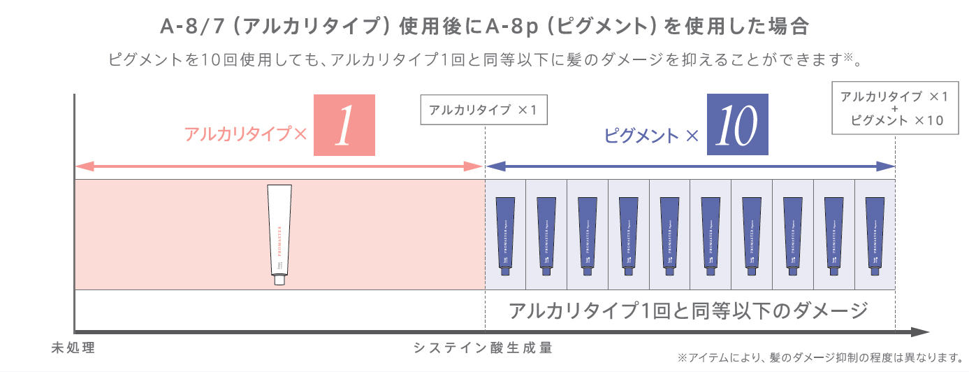毛髪中のシスチン結合が酸化ダメージを受けて、システイン酸が生成されると、毛髪強度の低下、タンパク 質の流出等、さまざまなデメリットの原因となります。ピグメントは、システイン酸の生成を抑制することができるため、髪のダメージを抑えながらヘアカラーを継続することができます。
