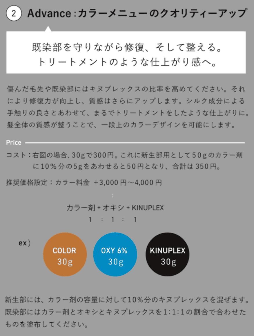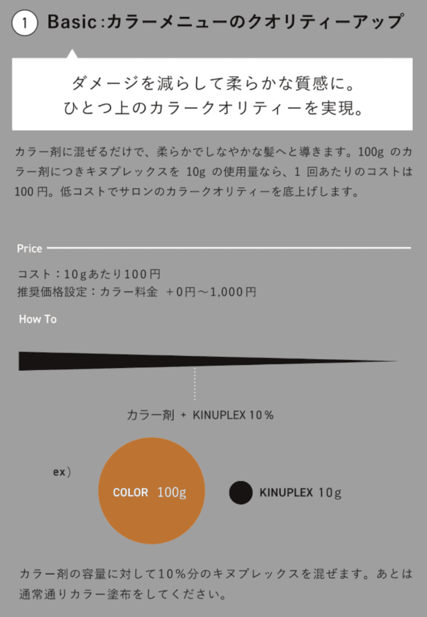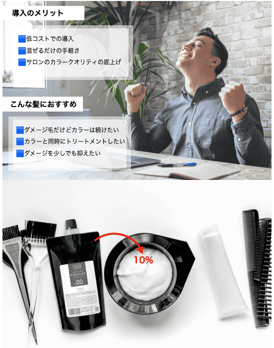 いま使用しているカラー剤、ブリーチ剤などに10%混ぜるだけで、減力せずにダメージを抑制、施術しながらシステムトリートメント並みの仕上がりを実現。