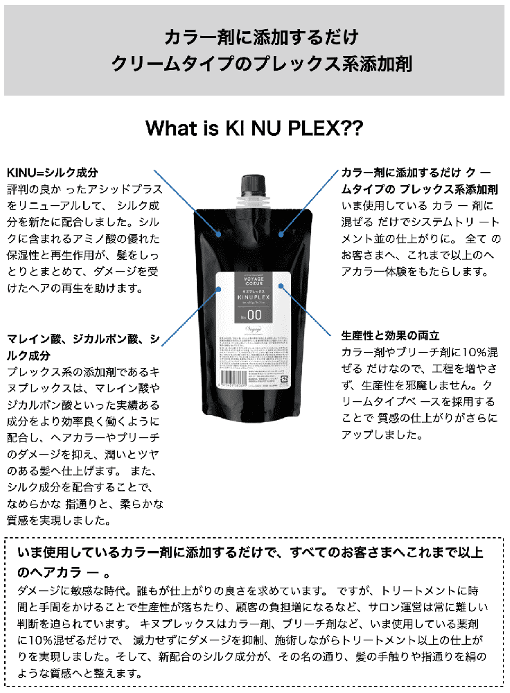 ヘアカラーに特化した、カラー剤に混ぜるだけのクリームタイプのプレックス系添加剤です。