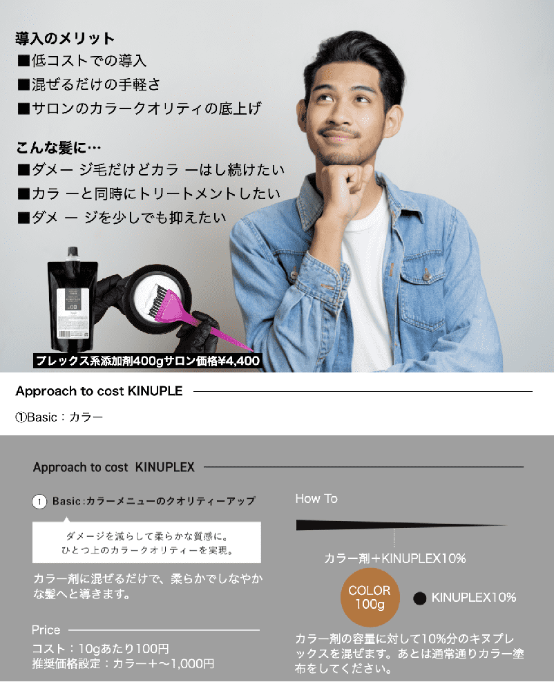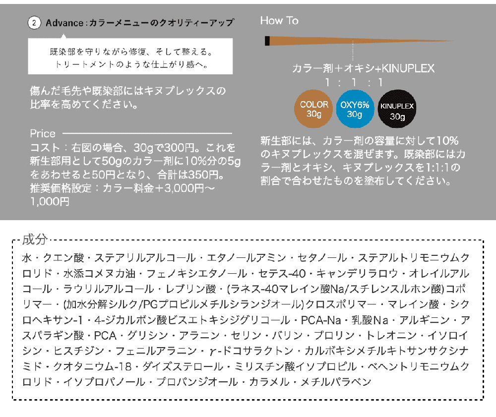 いま使用しているカラー剤、ブリーチ剤などに10%混ぜるだけで、減力せずにダメージを抑制、施術しながらシステムトリートメント並みの仕上がりを実現。