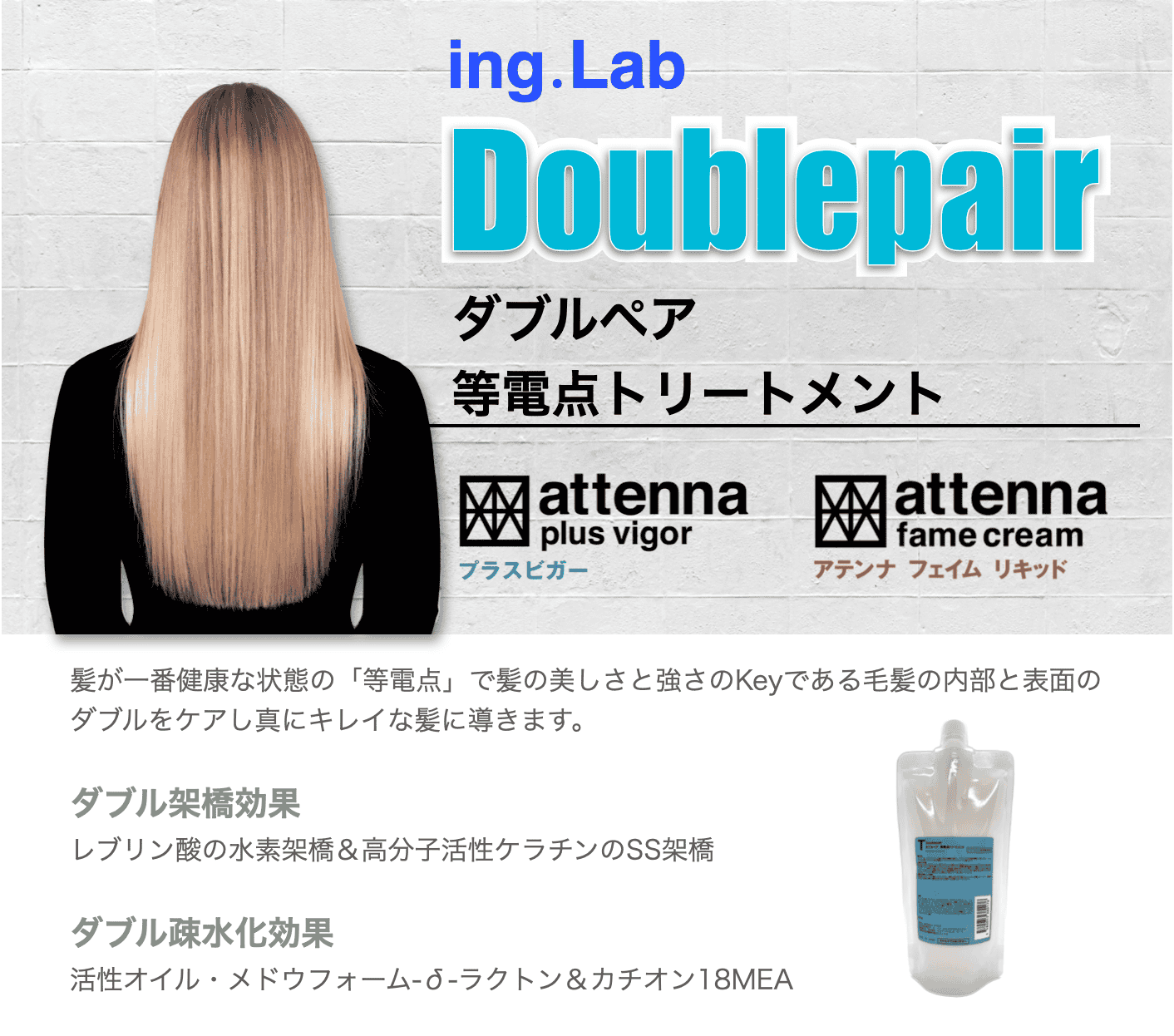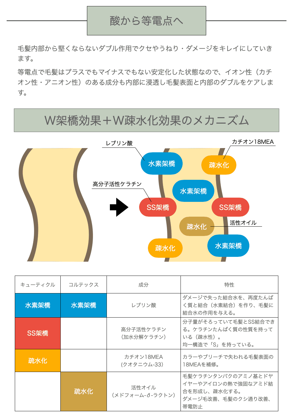 髪が?番健康な状態の「等電点」で髪の美しさと強さのKeyである?髪の内部と表?のダブルをケアし真にキレイな髪に導きます。