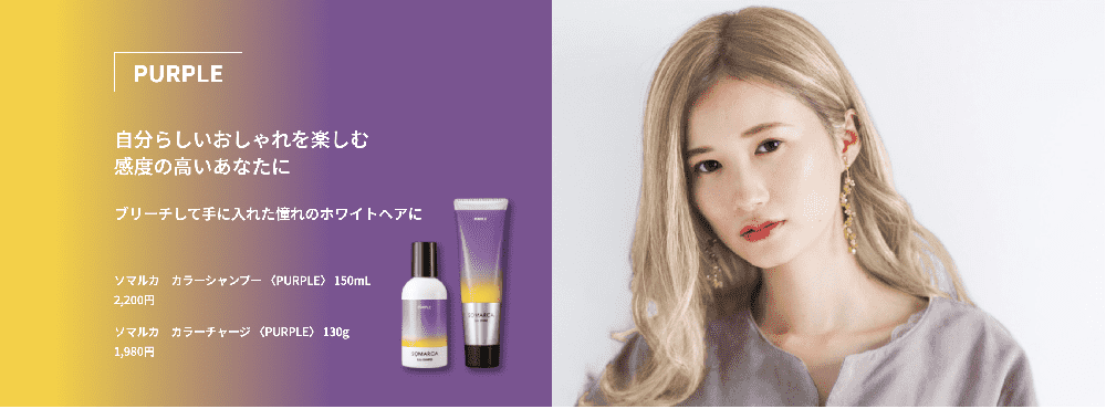 わたしらしくソマル。 サロンで染めた髪色をもっと楽しむ。 カラーシャンプーとカラーチャージのダブル使いで サロンカラーにさらに色をチャージするSOMARCA(ソマルカ)。 手軽なホームケアで髪のコンディションを整えながら、 お客様ご自身で髪色をコントロールしていただけます。