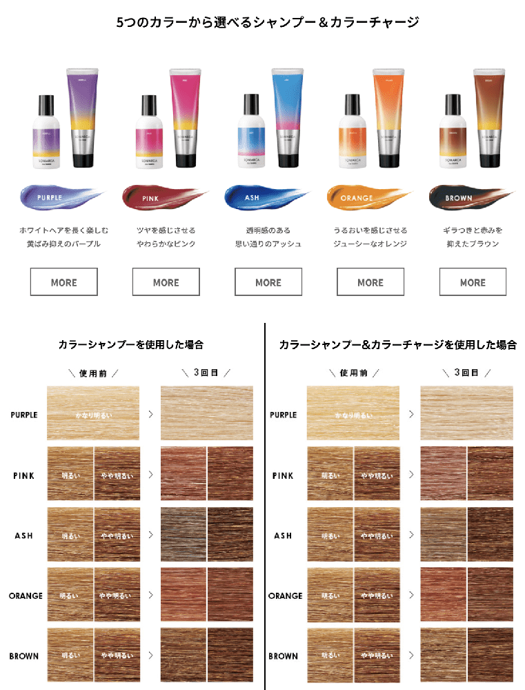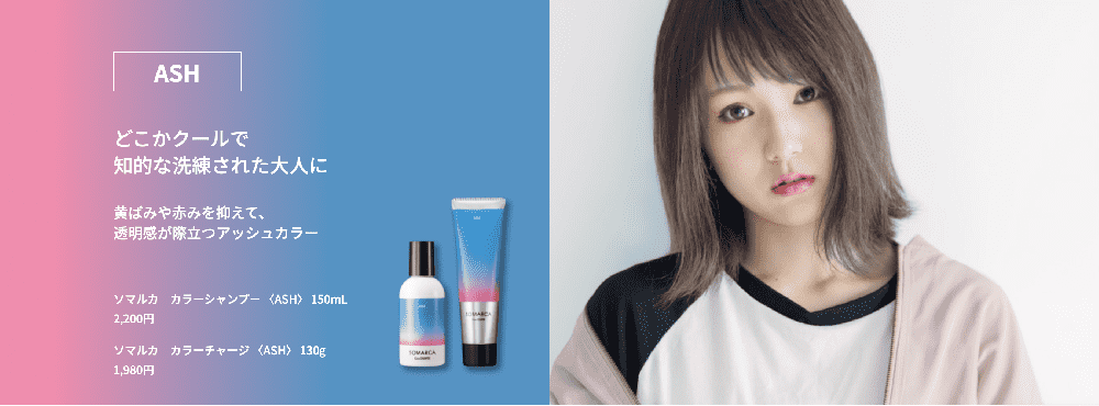 わたしらしくソマル。 サロンで染めた髪色をもっと楽しむ。 カラーシャンプーとカラーチャージのダブル使いで サロンカラーにさらに色をチャージするSOMARCA(ソマルカ)。 手軽なホームケアで髪のコンディションを整えながら、 お客様ご自身で髪色をコントロールしていただけます。 透明感のある思い通りのアッシュ