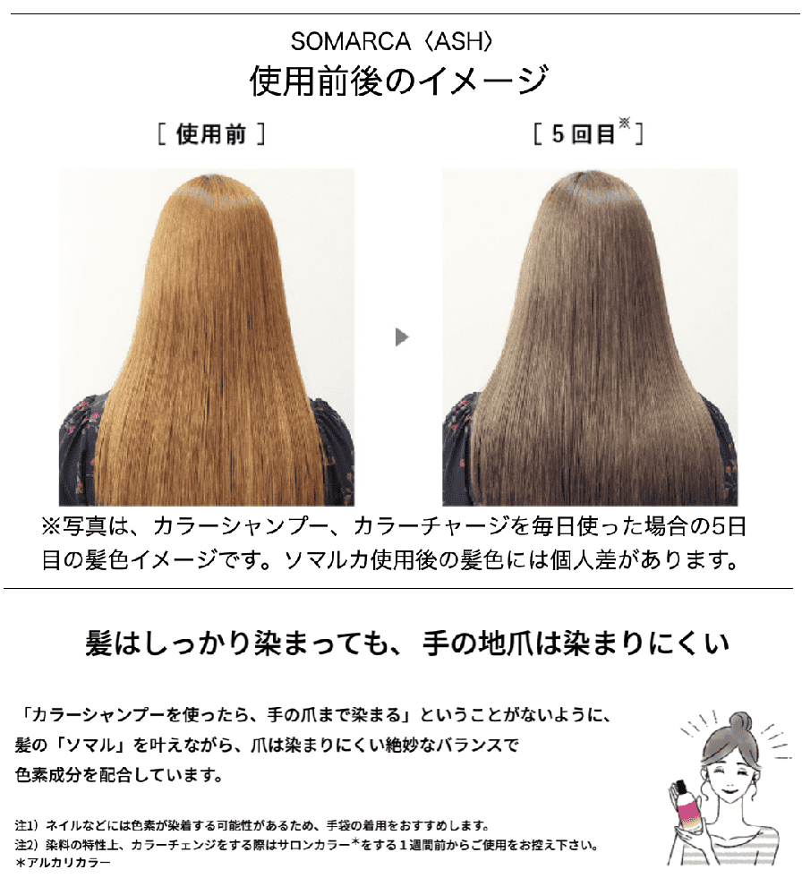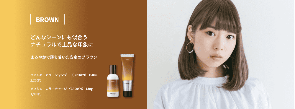 わたしらしくソマル。 サロンで染めた髪色をもっと楽しむ。 カラーシャンプーとカラーチャージのダブル使いで サロンカラーにさらに色をチャージするSOMARCA(ソマルカ)。 手軽なホームケアで髪のコンディションを整えながら、 お客様ご自身で髪色をコントロールしていただけます。 ギラつきと赤みを抑えたブラウン
